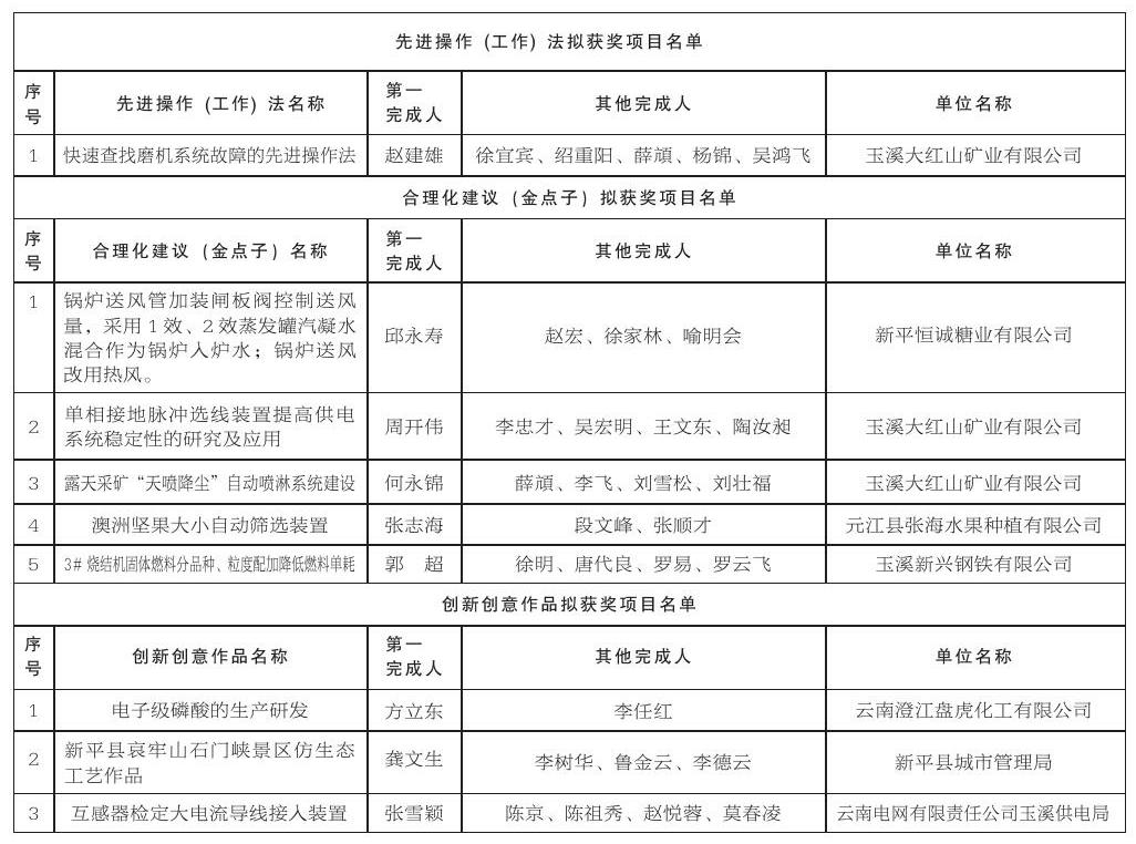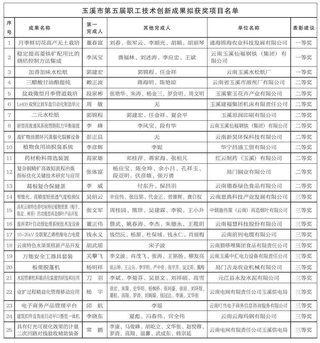玉溪市第五届职工技术创新成果拟获奖项目公示